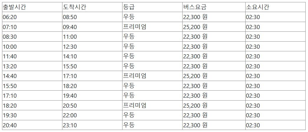 서울에서 강릉가는 버스 시간표 & 강릉에서 서울 버스시간표 동서울 강릉 버스 시간표 버스요금