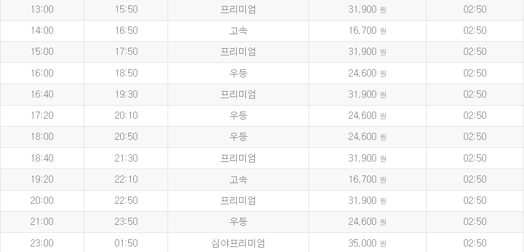 버스요금: 일반 16700원 우등 24600원 프리미엄 31900원