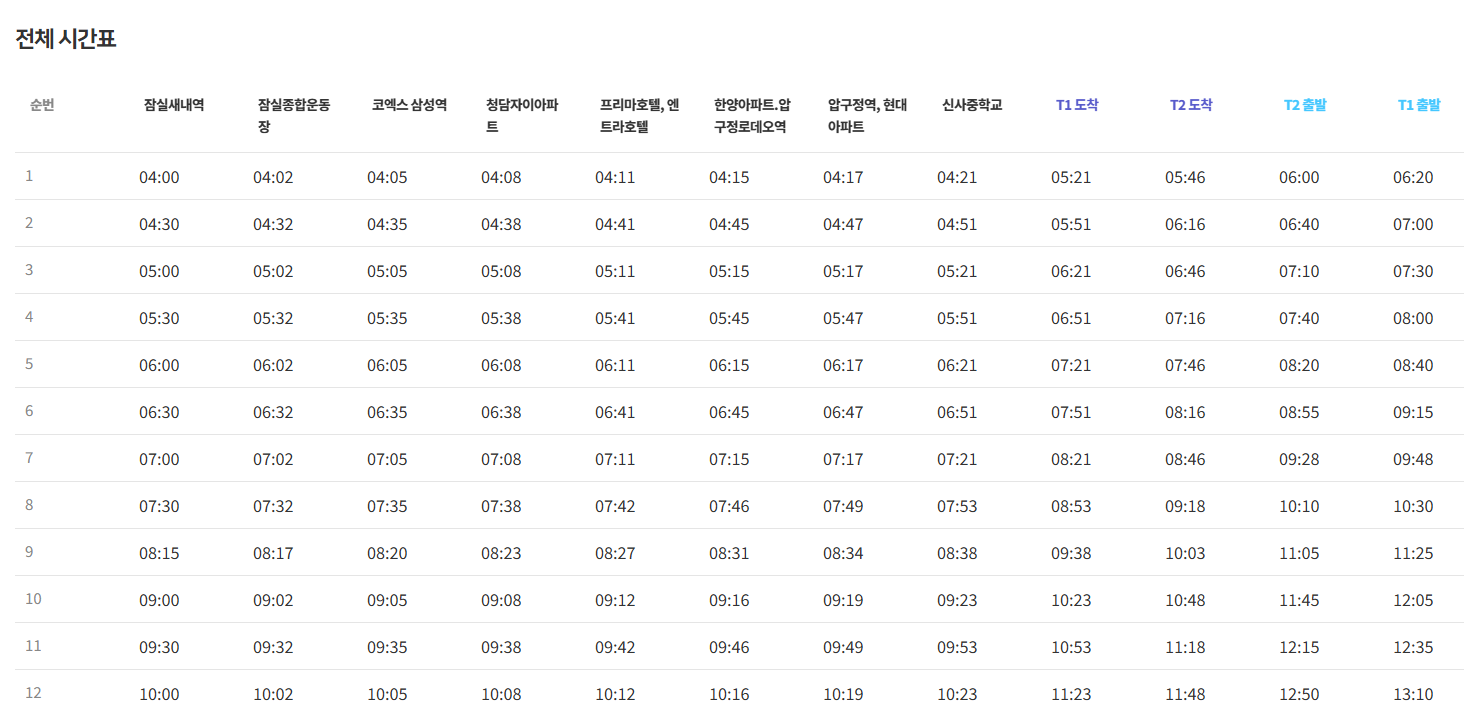 2터미널 첫차 6:00 막차 22:50